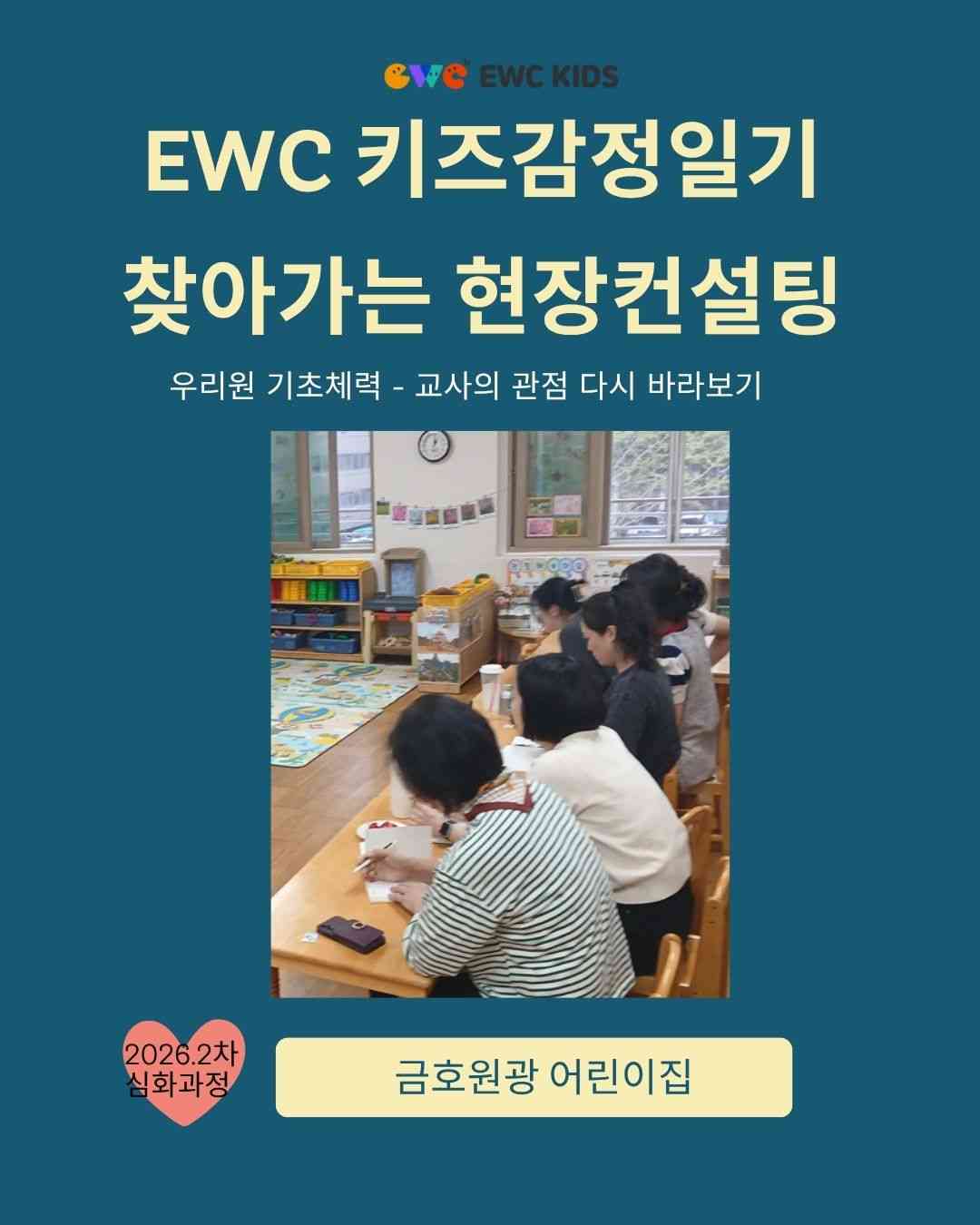 EWC 학습공동체 - 국공립 금호원광 어린이집 -우리원 기초체력-교사의 관점 다시 바라보기* EWC에서는 각 어린이집/유치원 들에 대한 핵심교사 밀착형 현장 교육을 실시하고 있습니다.전문적교사 역량강화를 위해 현장의 모습을 전해 드립니다.www.ewckids.comwww.iljishin.com